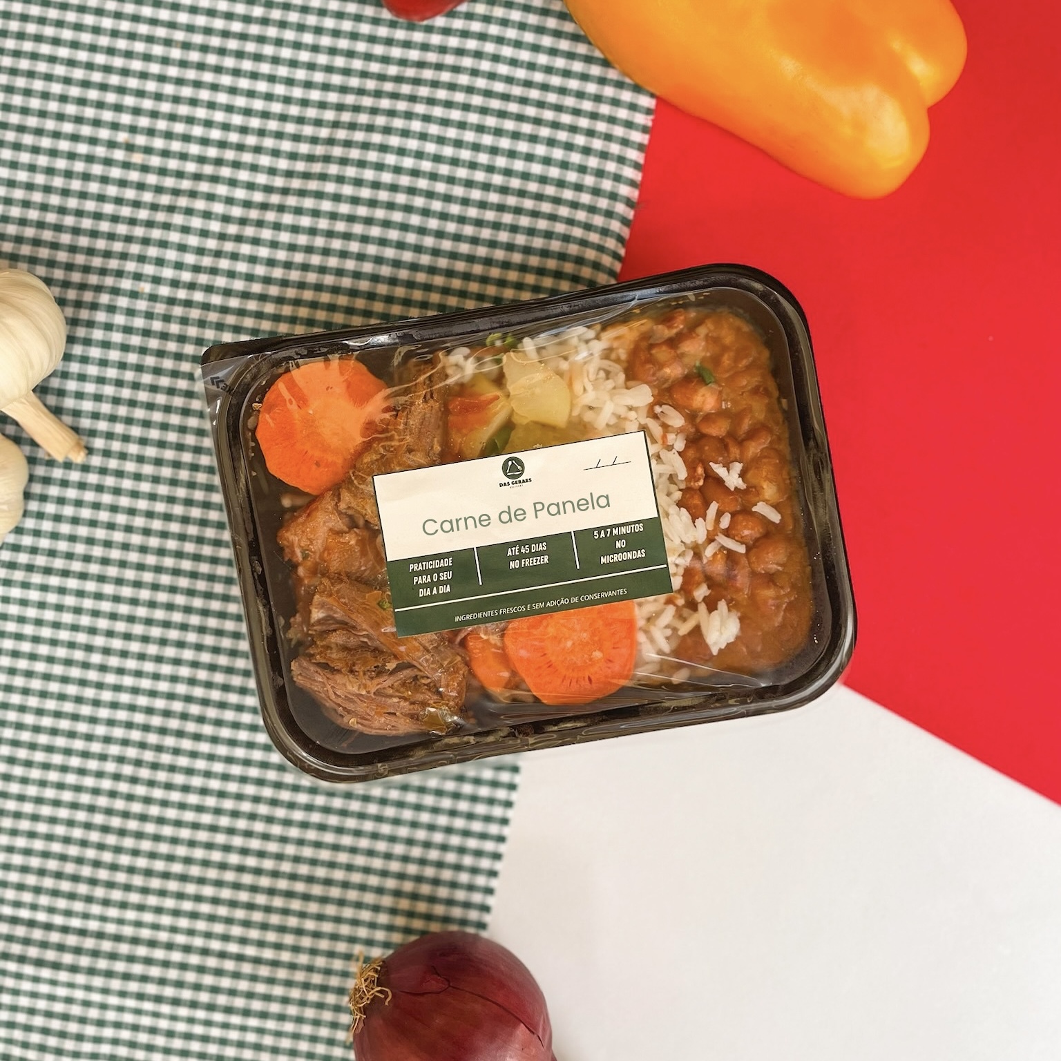Ingredientes: 100 feijão, 120 arroz, 120 de Carne de panela, 60 de legumes.