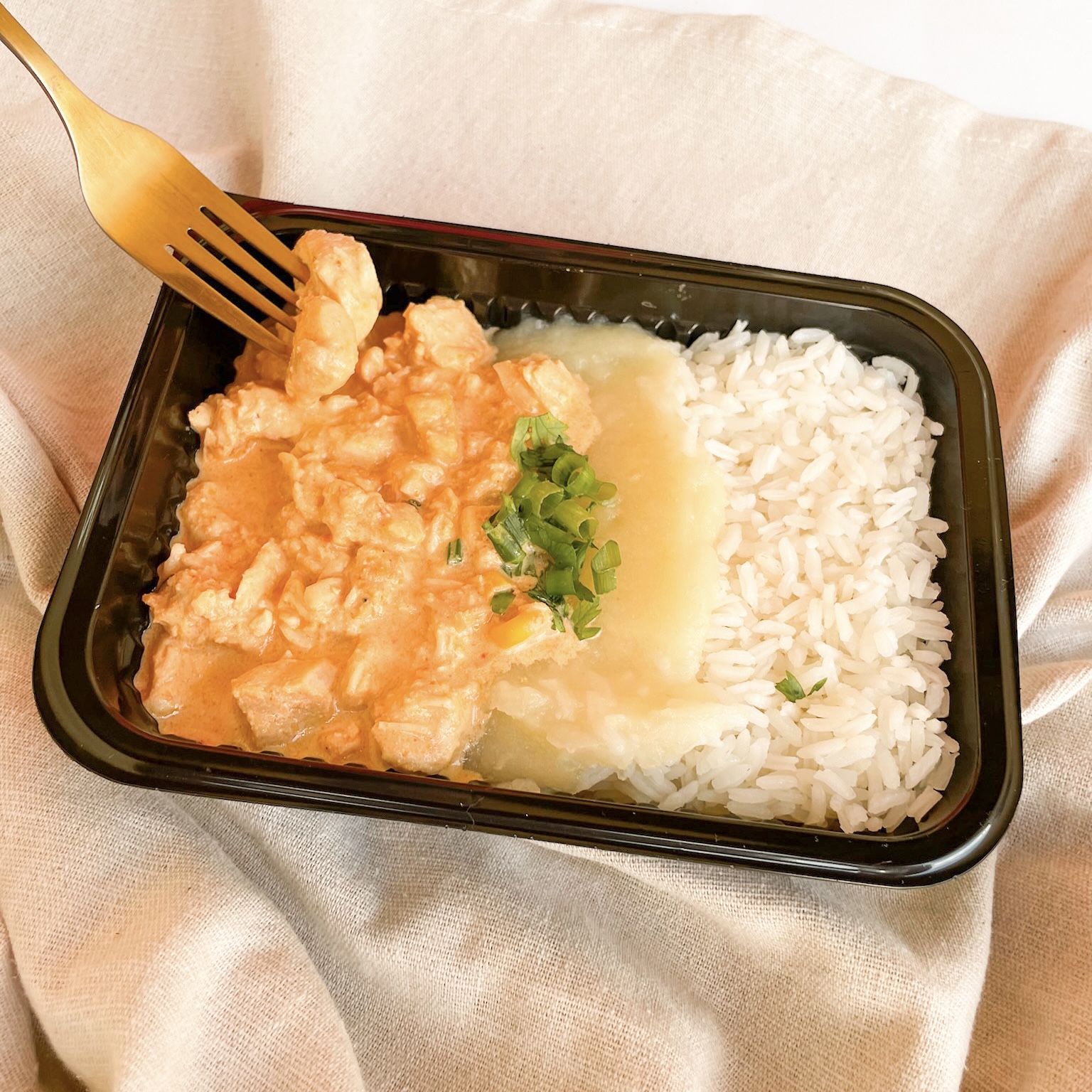 Ingredientes: Arroz, Purê de Batata Inglesa e Estrogonofe de Frango.